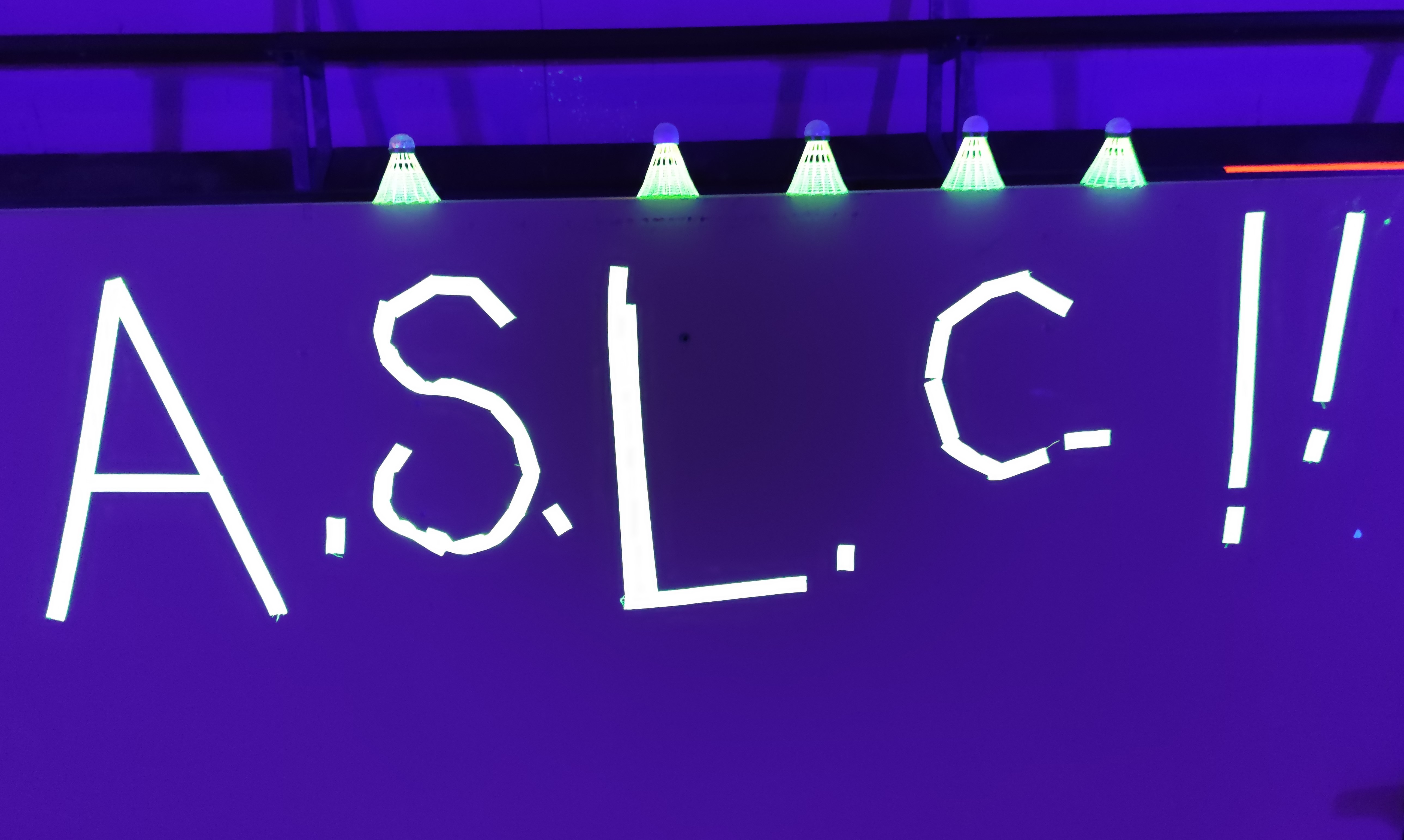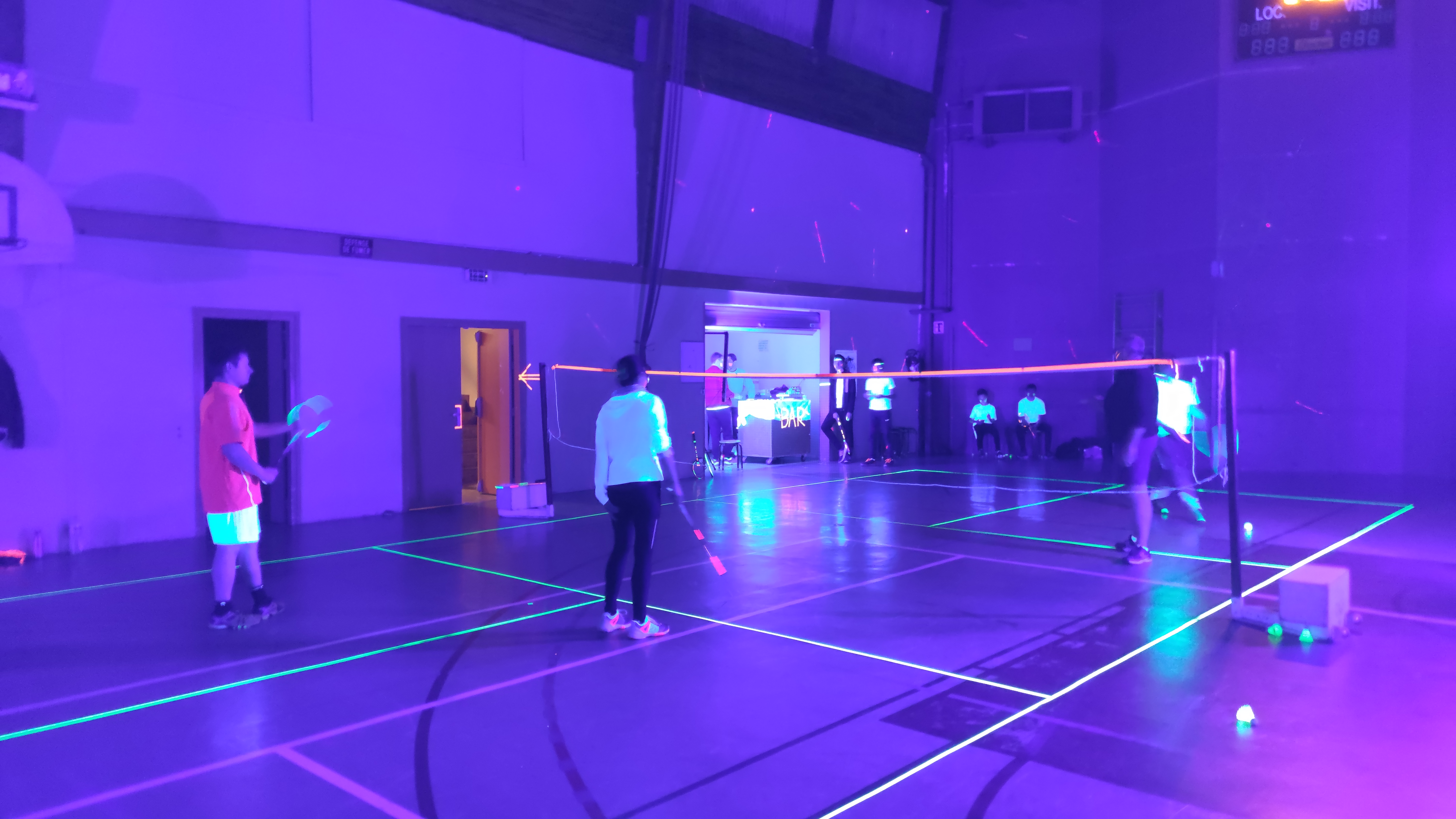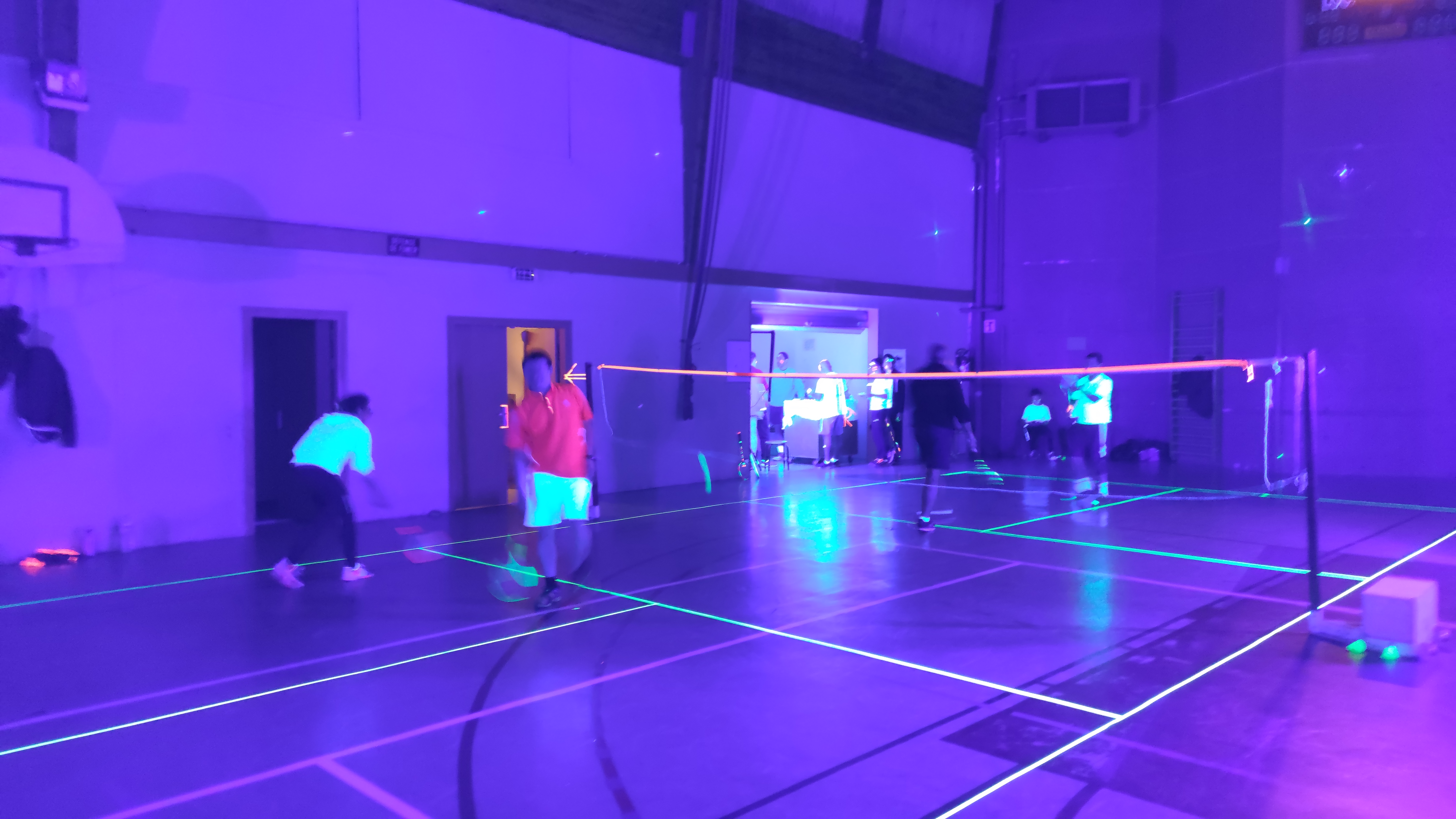Ce samedi 7 mars 2020, 40 personnes ont profité de l’animation proposée par l’ASLC, jouer au badminton dans le noir. C’est une première à Châteauneuf-sur-Sarthe, soutenue par le Crédit Agricole ! Les membres du bureau se sont mobilisés dès l’après-midi pour préparer la salle et le repas. Le ruban adhésif fluo (vert, jaune, orange, rose) a permis de déligner les cinq terrains. Le prestataire IdeaSports a installé des lampes UV pour l’ensemble de la salle.