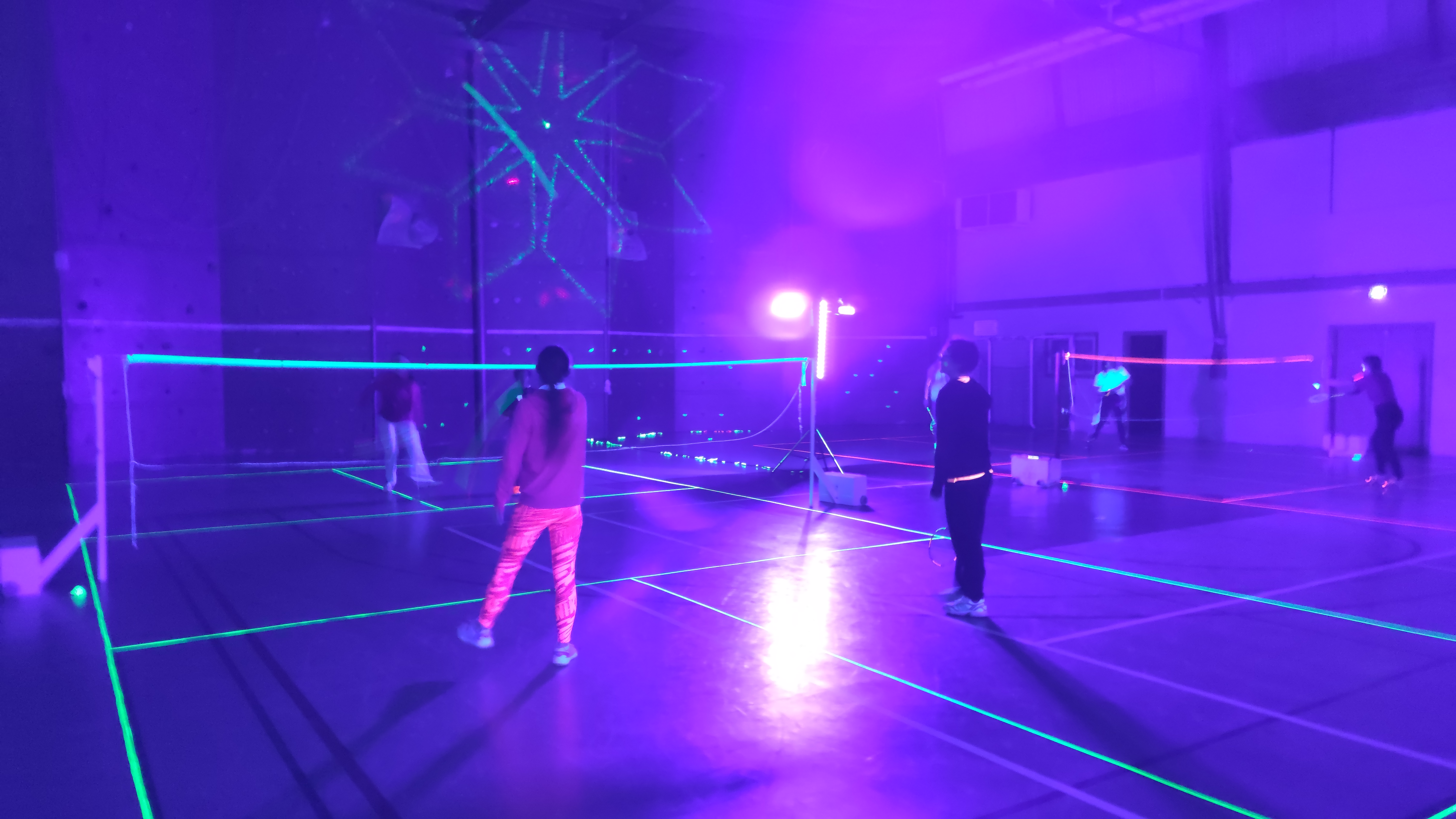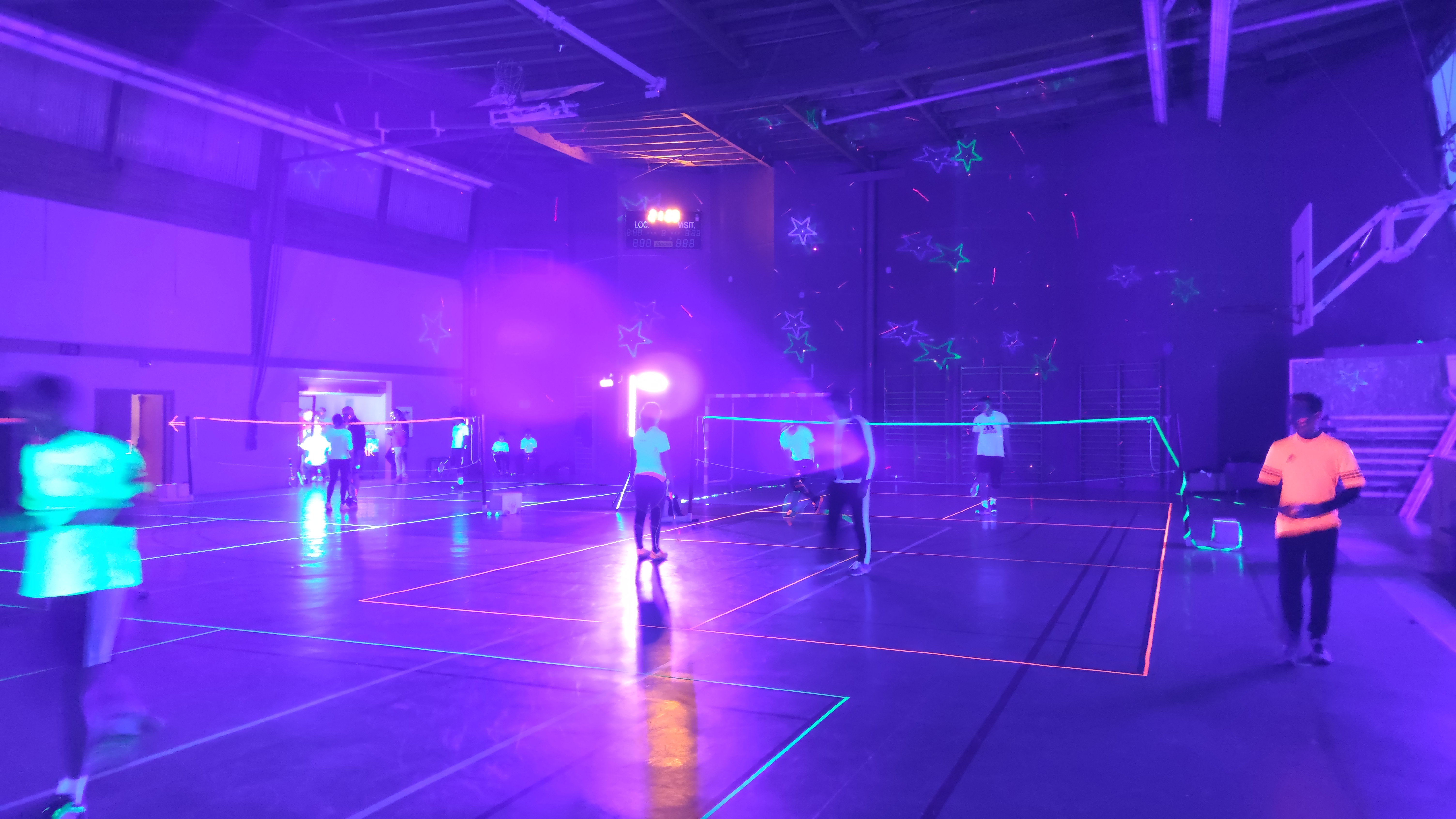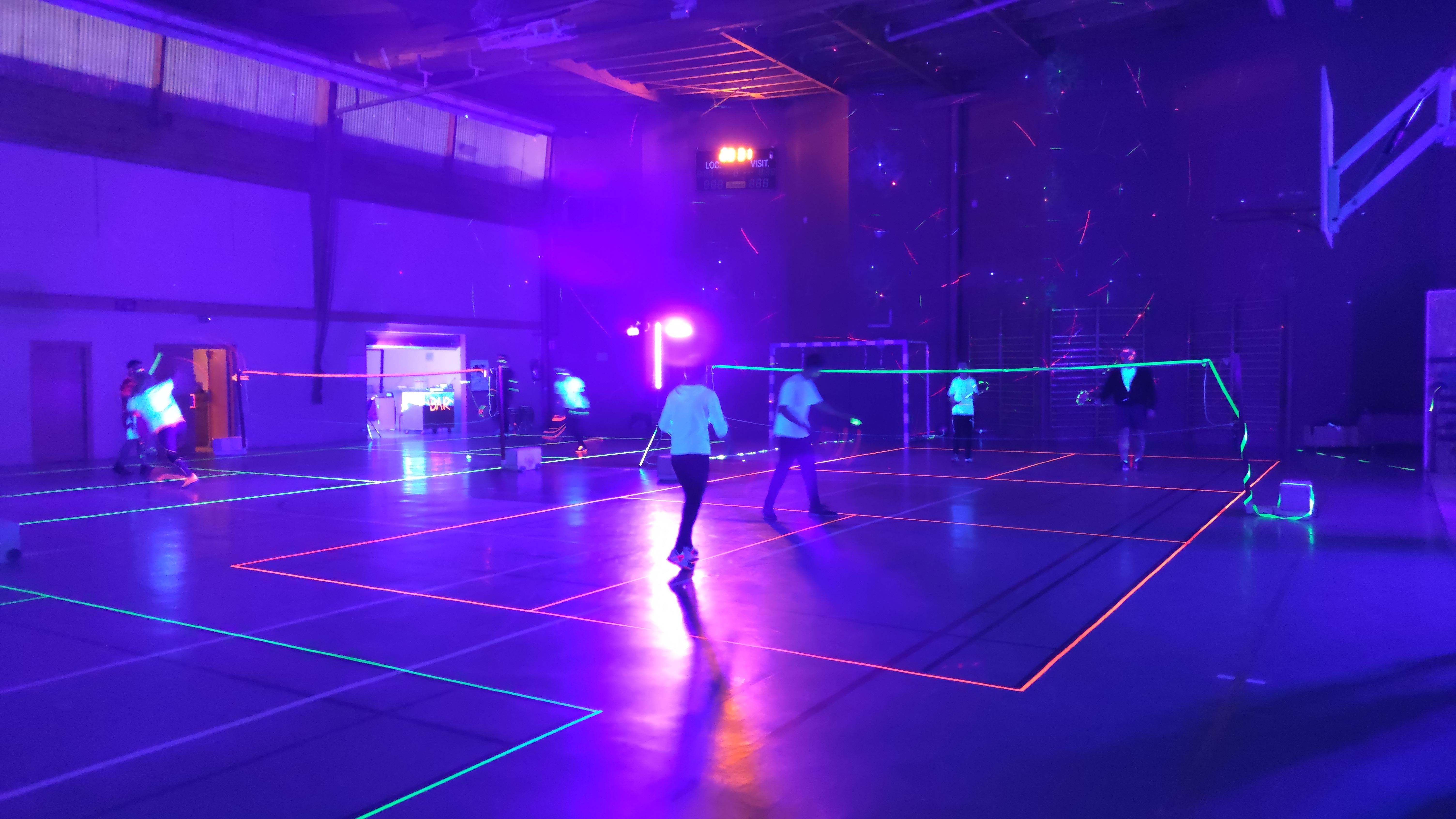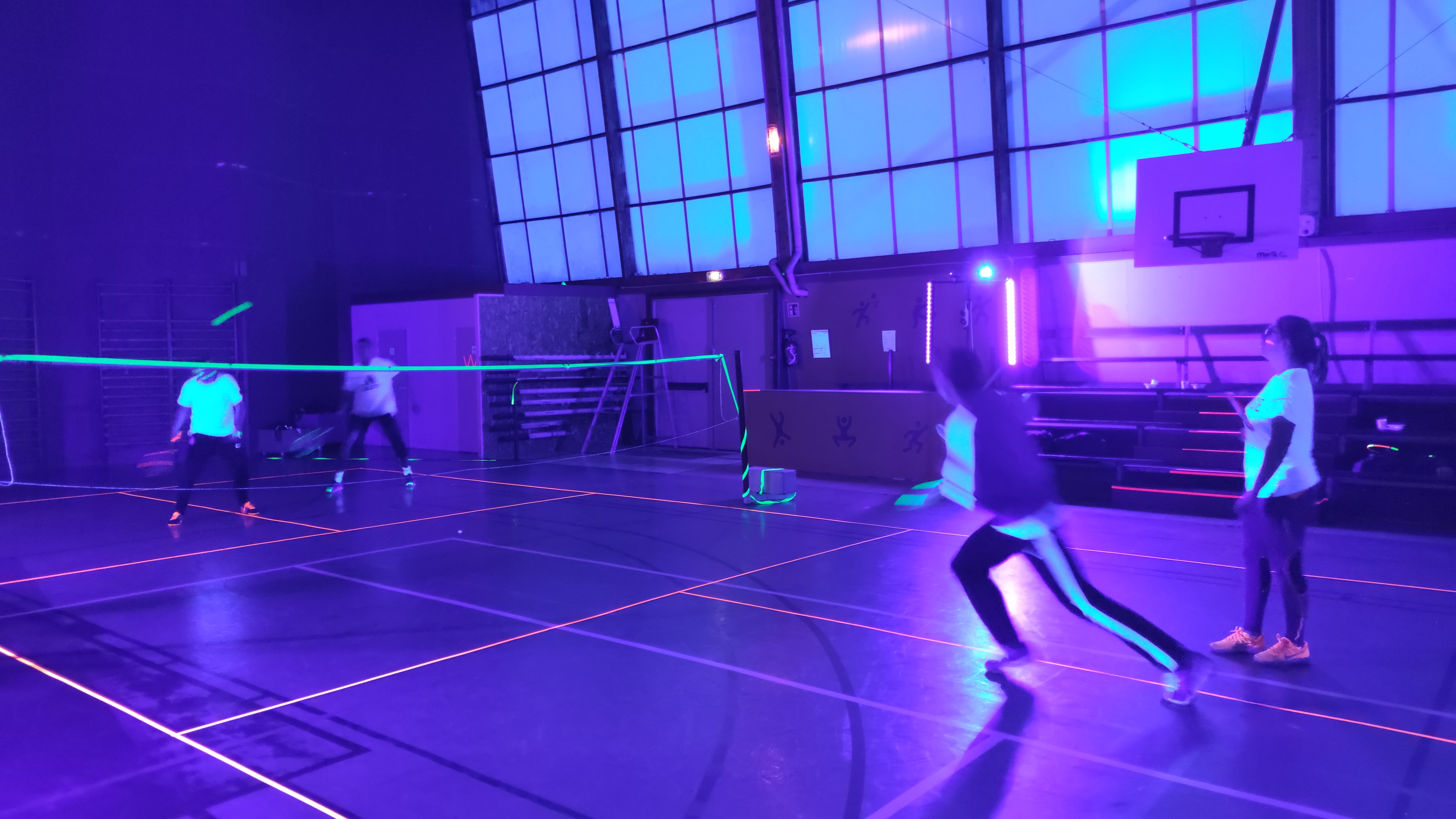 Ce samedi 7 mars 2020, 40 personnes ont profité de l’animation proposée par l’ASLC, jouer au badminton dans le noir. C’est une première à Châteauneuf-sur-Sarthe, soutenue par le Crédit Agricole ! Les membres du bureau se sont mobilisés dès l’après-midi pour préparer la salle et le repas. Le ruban adhésif fluo (vert, jaune, orange, rose) a permis de déligner les cinq terrains. Le prestataire IdeaSports a installé des lampes UV pour l’ensemble de la salle.